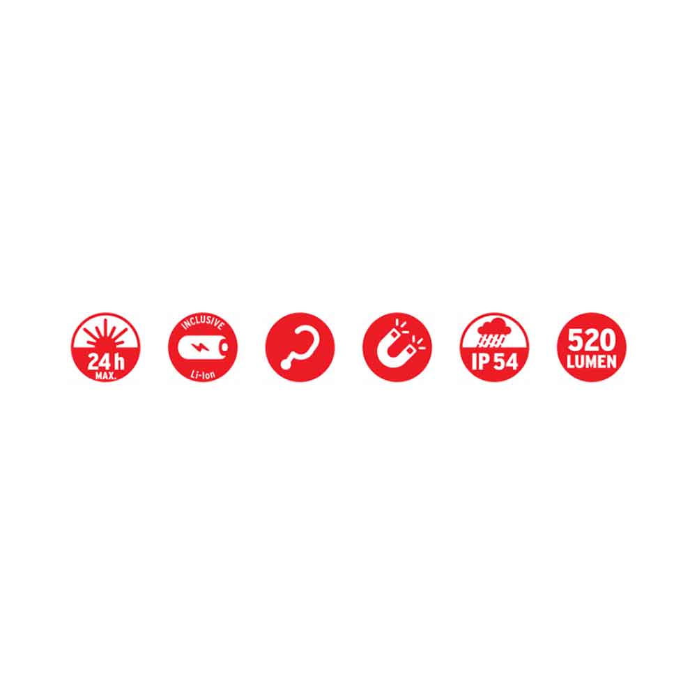 • Luz de trabajo luminoso mediante 12 LED SMD Seoul luminosos, iluminación hasta 24 horas y conmutable en 3 etapas de luz: 100 % – 40 % – 10 %una larga duración del tiempo de iluminación